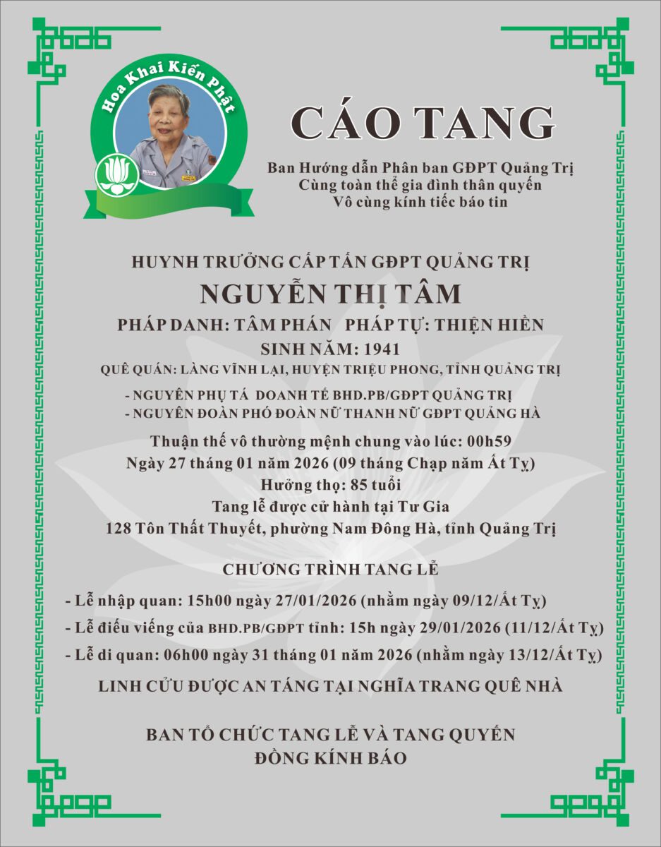 – Lễ điếu viếng của BHD.PB/GĐPT tỉnh: 15h00 ngày 29 tháng 01 năm 2026 (nhằm ngày 11 tháng chạp năm Ất Tỵ)